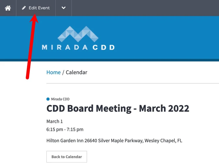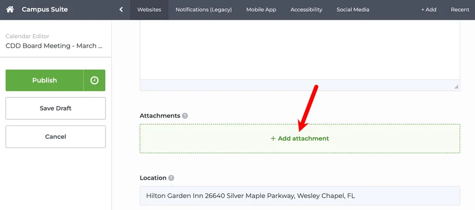 While editing the event, scroll down where you see Add Attachment. Here is how you attach an Agenda to the meeting. Be sure to properly name your file BEFORE uploading it to the website. This is important for ADA purposes.