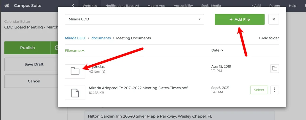 Now, you can select your file in the list to attach it to the meeting event. You can always come back in and attach new documents as needed and events can have multiple documents attached. Now Publish your event to update.
