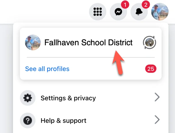 When accessing Facebook, make sure you're on your school's Facebook page and not your personal account. To do this, select your school's profile in the upper-right corner of the page.