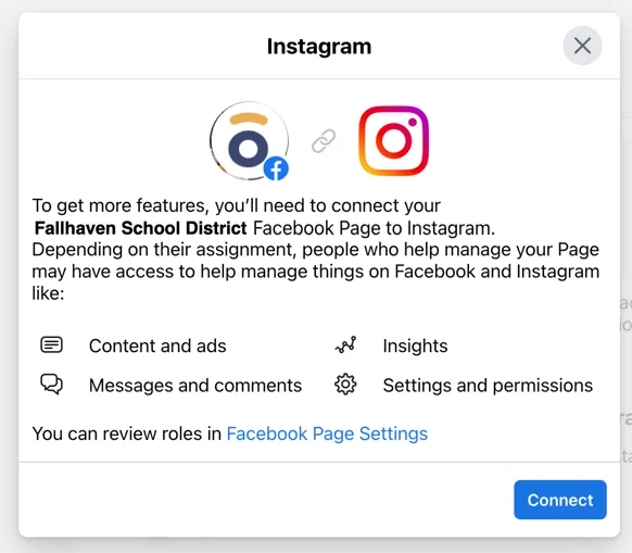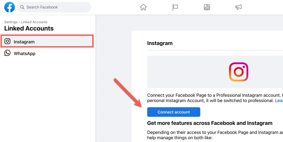 Once you select the "Connect account" button, follow the prompts to log in to your Instagram account and link it to the Facebook page.