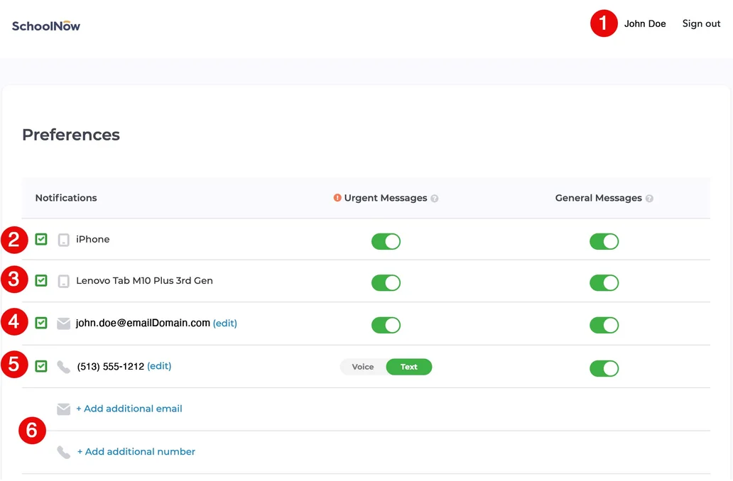 4. The email address on file with the school. By default, email addresses are subscribed to both Urgent and General messages. You can change this at any time.