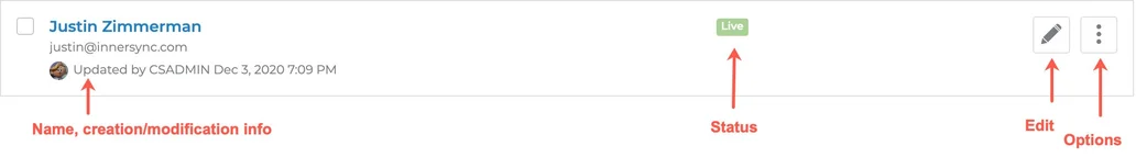 The status of a person's profile is listed to the right of the person's name (in the center). Options are LIVE, DRAFT (if there is a draft of unsaved edits), SCHEDULED (a date for the changes to go live), SHARED (if it's been shared from another department), and LOCKED (meaning someone else is working on it.)