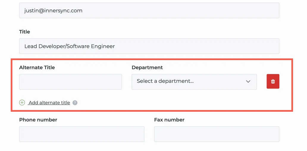 Alternate titles are titles that are different from the one entered into a person's Basic Profile. For example, a person might be a science teacher and a football coach for the school. The alternate title will be displayed by entering an Alternate Title for a person, selecting a department, and finally sharing their Profile with that department.